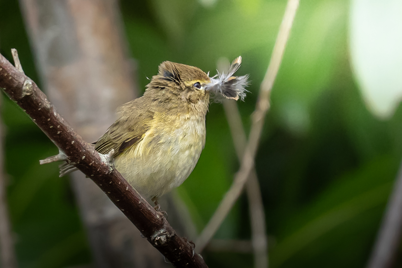 Pouillot véloce plume en bec pour construire son nid
